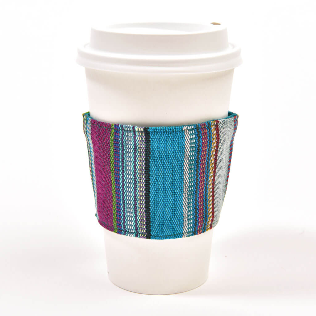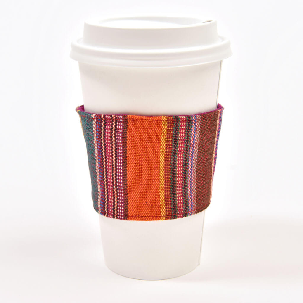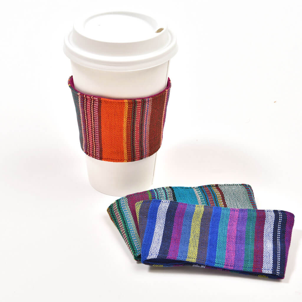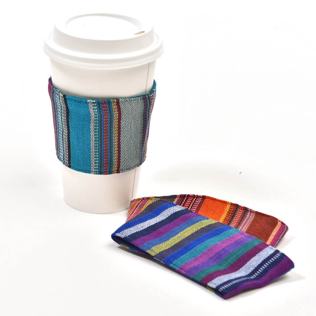 Another step to zero waste – reusable cup sleeves. Skip the disposable paper! Handwoven in 100% cotton, ours are easy to carry with you, and can be machine washed/dried. They fit most take out cups – hot or cold!