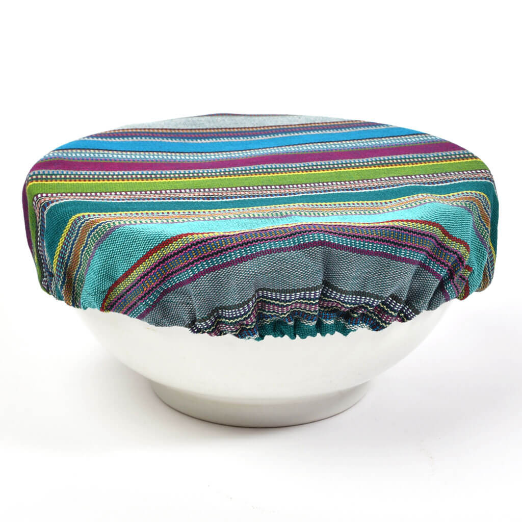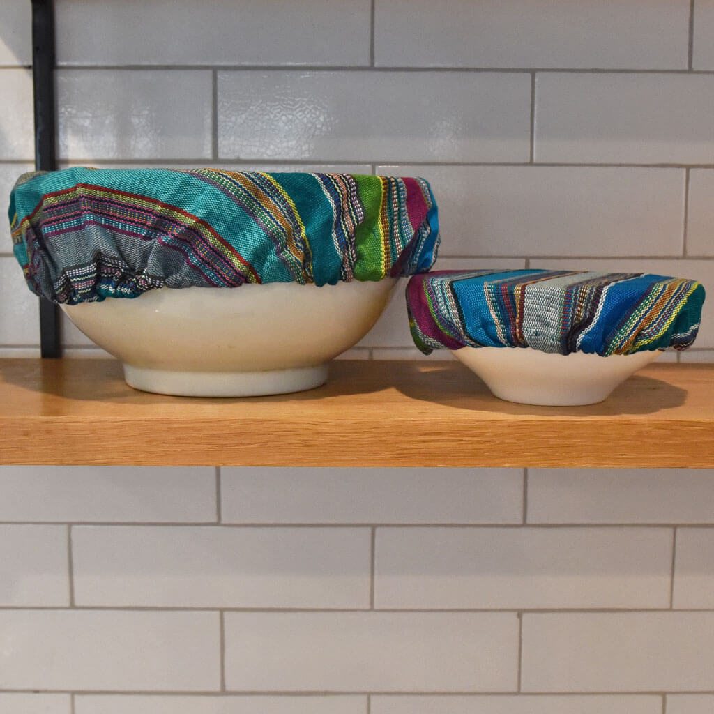 Washable reusable fabric bowl covers are perfect for your sustainable lifestyle. You’ll find so many ways to use them -- to cover your leftovers to warm up the next day, to cover your in process cookie project when you are interrupted, to cover your proofing bowl when you make bread. Handwoven 100% cotton is secured with elastic to fit a range of sizes. The large size fits bowls between 9" - 12". The small bowl fits bowls between 5" - 8".