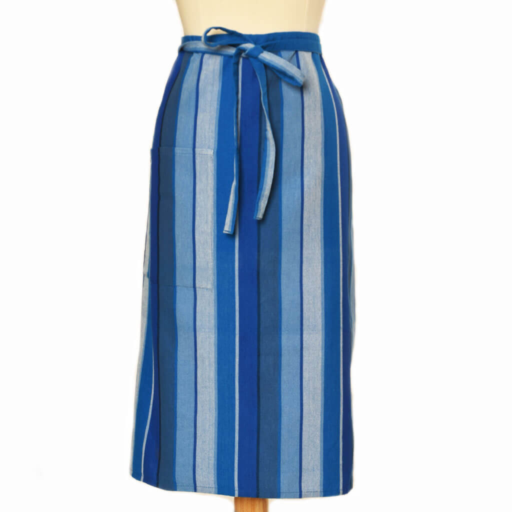 Stripes in rich shades of blue will be eye catching while you are wearing this bistro apron. Extra long ties can be tied in the front. You can adjust the length by rolling up the waistband, too! There is a convenient front pocket. Handwoven in 100% cotton it is long lasting and easy to care for.