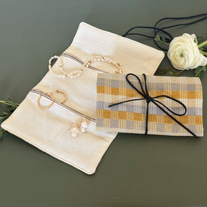 Our mini jewelry rolls are just the right size to carry your favorite pieces while traveling or keep them organized at home. Our Champagne Cuadritos weave is a sturdy weave in classic champagne and pearl gray. Lining is made of hand loomed fabric in a cream. Roll up and tie with a vegan cord. Tuck your jewelry into 2 large and 2 small pockets, all zip close to keep everything secure.