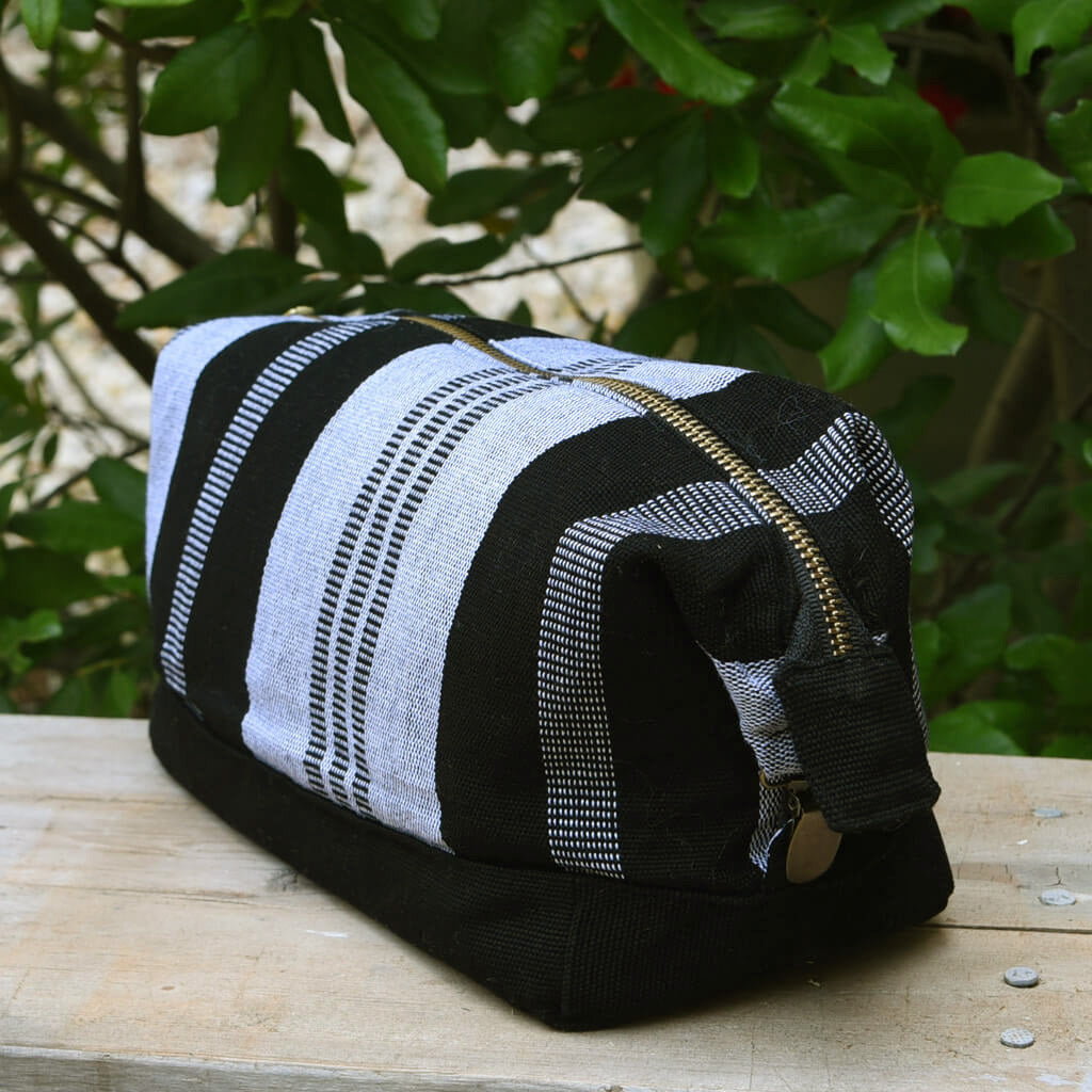 A practical solution for holding your shaving gear or toiletries, our Dopp kit/toiletry bag will tuck easily into your overnight bag or your suitcase. Handwoven in a sturdy cotton canvas in black and gray stripes, it has been lined with waterproof ripstop nylon. A full length brass zipper gives easy access to your gear. Suspender style tie downs at either end allow you to make the bag fit your contents. Great for traveling, leave it on your counter between trips.