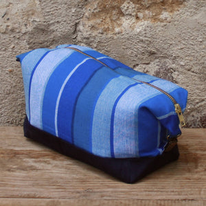 Sturdy cotton handwoven stripes in Stormy Blues toiletry travel bag has been lined with waterproof ripstop nylon. There is ample space for all your bathroom essentials while you are traveling or at home. Antique brass suspender clips adjust the size if you are traveling light. A brass zipper closes across the top. .
