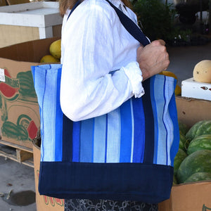 You'll find rich shades of blues in our Stormy Blue Market Tote -- a practical and stylish solution to the zero waste challenge for all your shopping. Good looking, lightweight, and roomy, it will accompany you to the farmer’s market or to your favorite vintage dress shop. Handwoven in a sturdy cotton, it has been designed with 2 convenient straps. Use the longer strap over your shoulder or pick up the tote by the short straps to carry in your hands. The base and straps are a coordinating navy canvas.