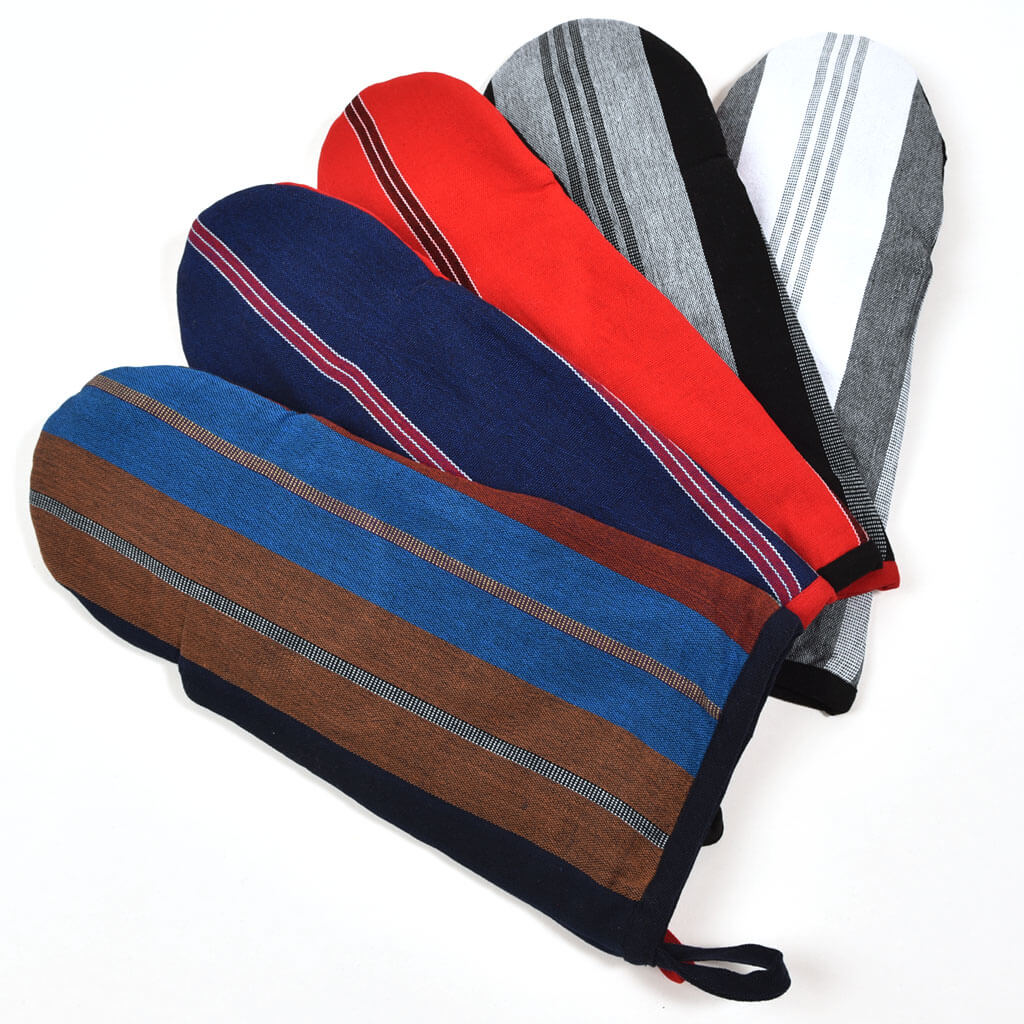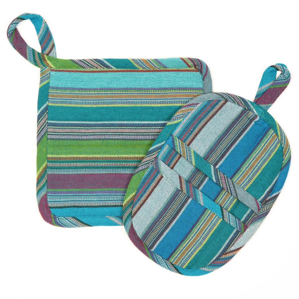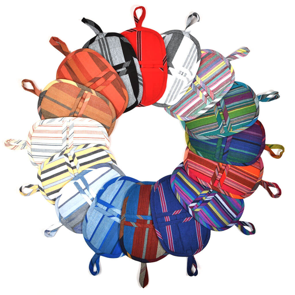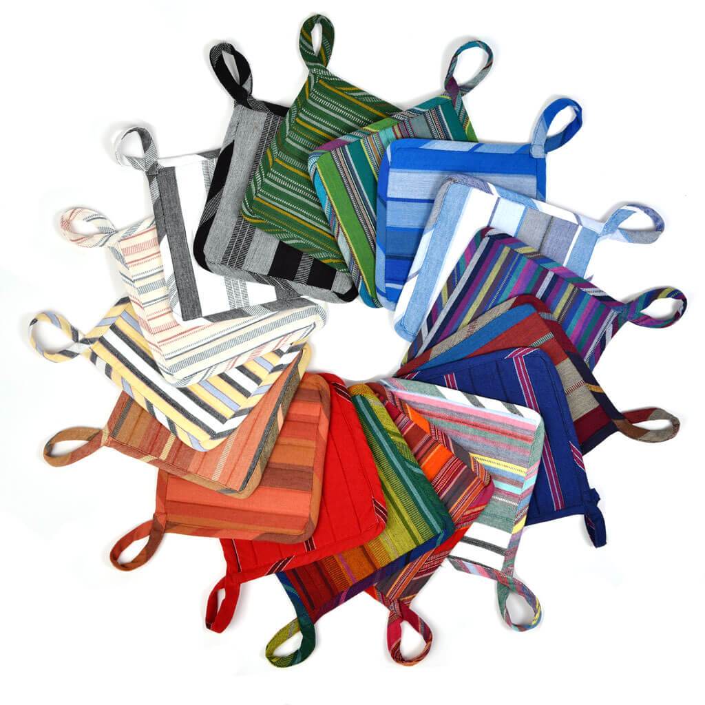 Colorful stripes in three styles of handy potholders. The gripper style features two pockets to slide your fingers in when grabbing something from the oven or taking a pot off the stove. The traditional style is squared off. Both styles are lined in Insulbrite™ with two layers of cotton insulation for protection/ There is a self-fabric loop for hanging. For a perfect hostess gift, match one of each, or pair the gripper potholder with a kitchen towel. And for the barbecue, we added Novex for extra protection against the heat for our Barbecue Mitts.