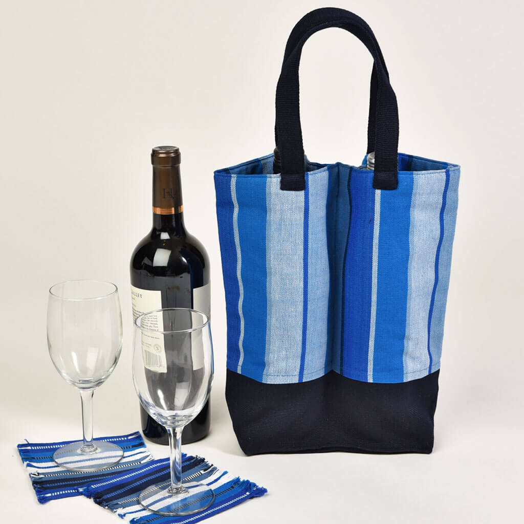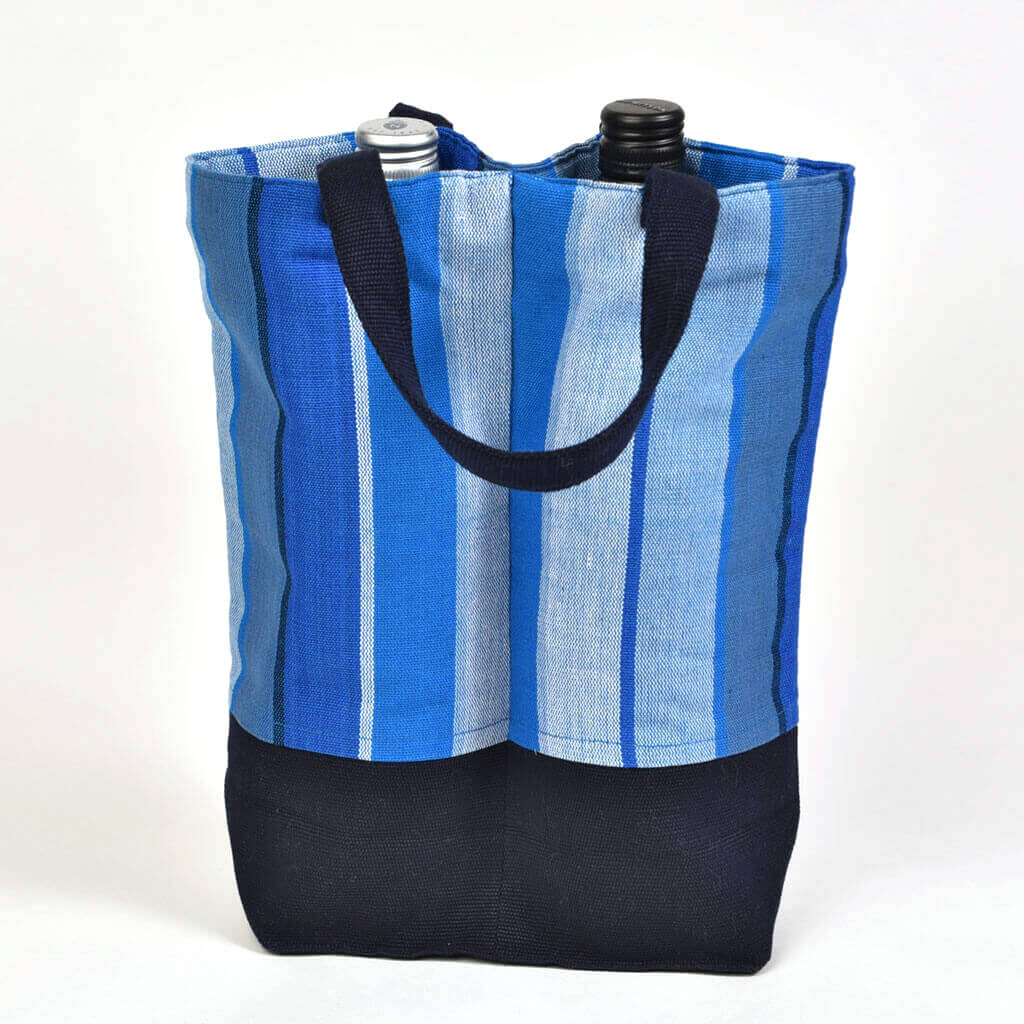Hand Woven Wine Bottle Tote | Double in Stormy Blues Stripe