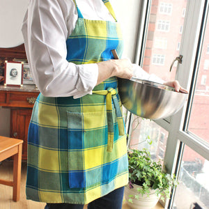 Plaid-patterned twill bib apron in bright blue and yellow is stylish, practical, and durable! The ample ties will fit most sizes, and a deep double pocket is ready to stash your kitchen towel, wooden spoons, or your cell phone.