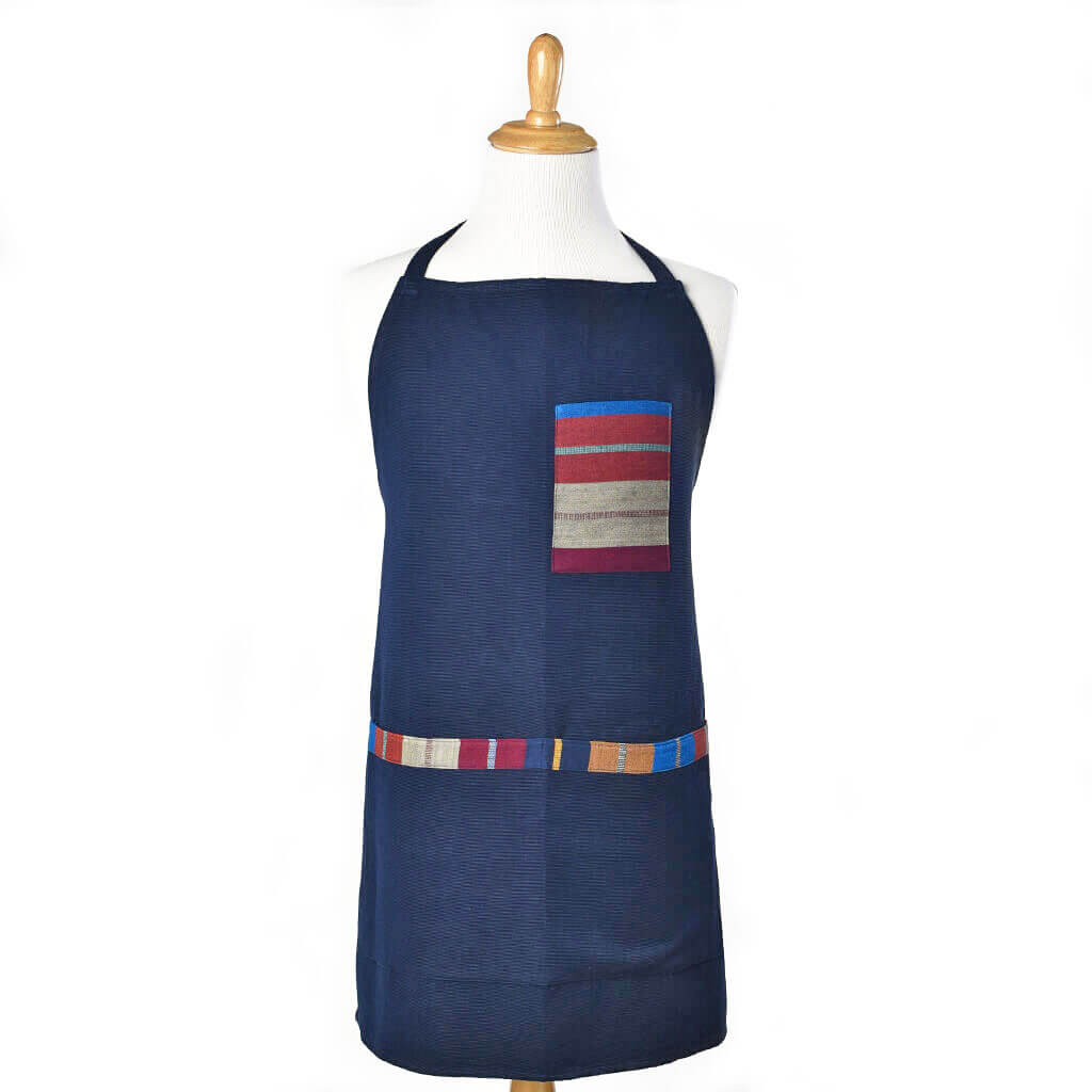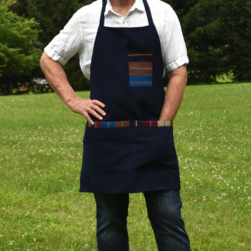 A must have for handy types, our durable all-purpose navy blue canvas apron goes from behind the grill to the workshop to the garden. Easy fit with an adjustable D ring neck strap and generous waist straps to fit most men. Keep your cellphone and pencils handy in the chest-high pencil and phone pocket. Keep your tools handy in the generous double front pocket. The durable handwoven cotton canvas will last through many turns in the washing machine or dryer.