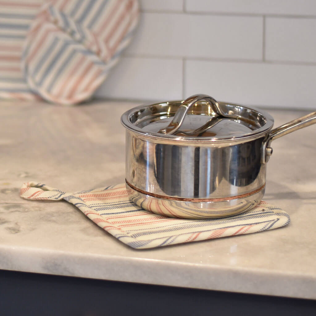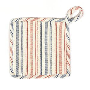 Traditional square potholder in cream, cinnamon, and blue "Ticking Stripe" is quilted and lined with Insul-brite®, to make working at the stove more comfortable. There is a convenient self fabric loop for hanging. Handwoven in 100% cotton.