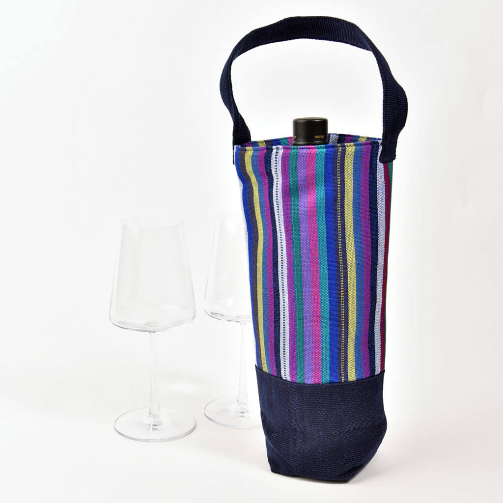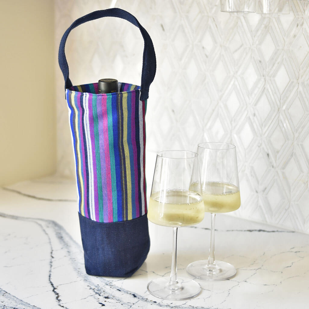 Hand Woven Wine Bottle Tote | Single in Cobalt Stripe