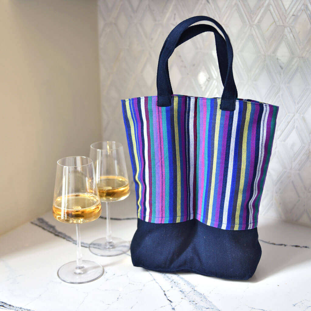 Hand Woven Wine Bottle Tote | Double Cobalt Stripe