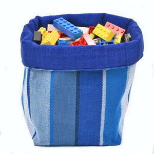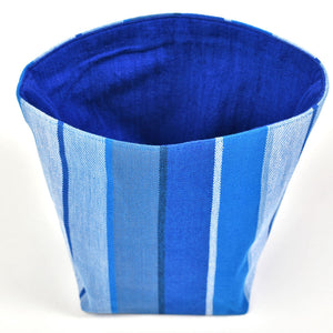 Stormy Blues striped Fabric Storage Basket is an opportunity for stylish organizing! Rich tones of BLUE stand out in many contemporary rooms. The base is 5" x 5" with a 7" height -- roll it down a notch to show off the contrasting cobalt lining. It's reversible too! Use to organize socks, hats, or scarves; craft supplies, the spare toilet paper roll in the bathroom, or small stuffed animals and toys in the kids' rooms. Perfect for showing off a potted plant, too!