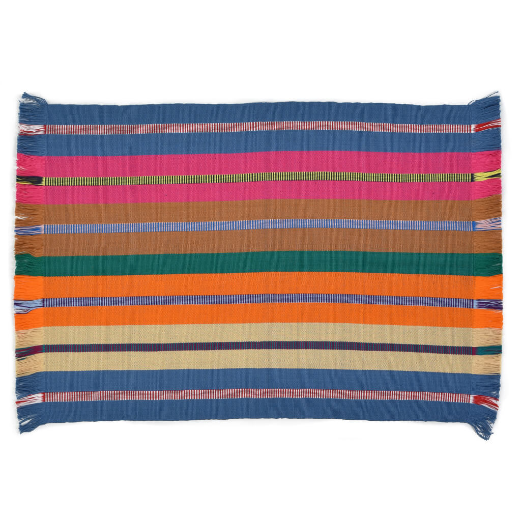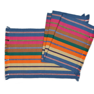 Hand woven on the backstrap loom in blue gray with subtly vibrant deep pink, orange, caramel, and champagne, the set of 4 placemats make a substantial statement on your table! They are a generous 19" wide by 14" high with a 11/2" fringe.