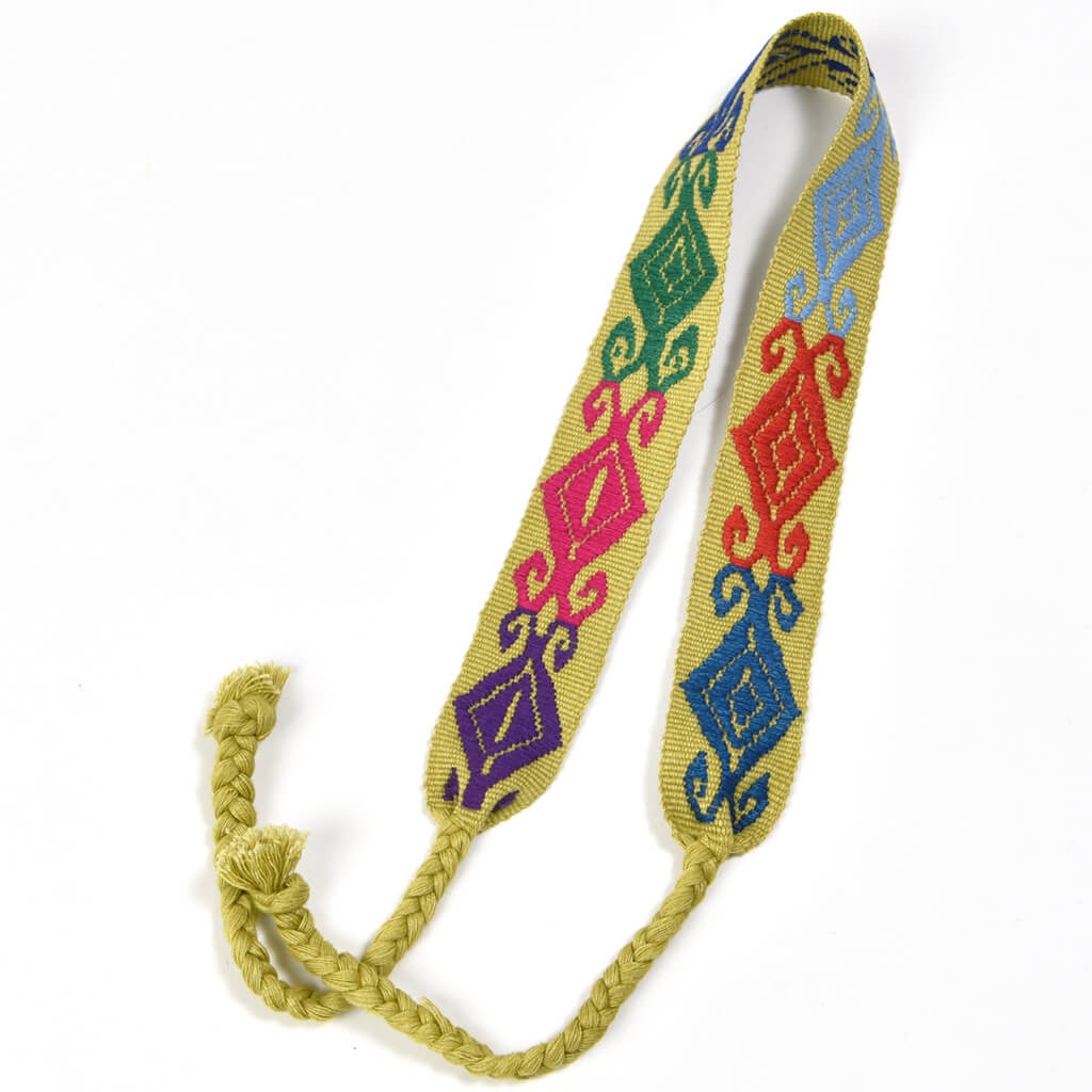 One of a kind embroidered headband woven in lime yellow on the backstrap loom...for the young and young at heart! Braided ties make for a comfortable adjustable fit.