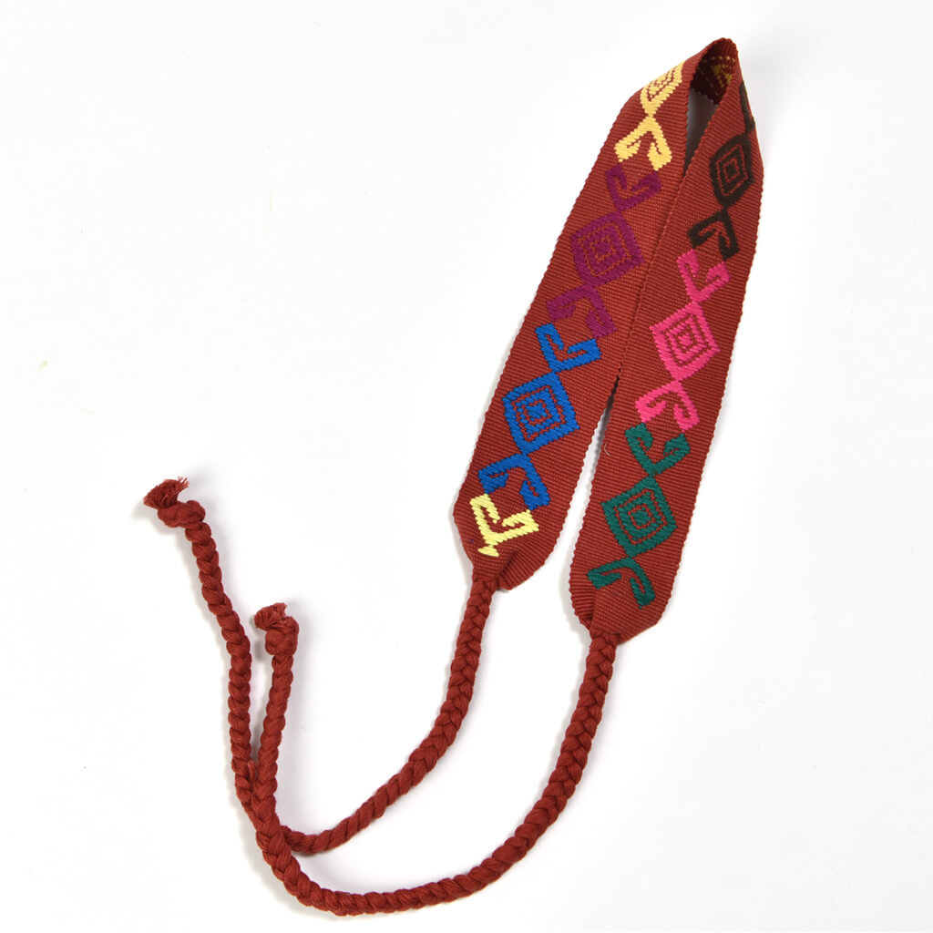 One of a kind embroidered headband woven in rust on the backstrap loom...for the young and young at heart! Braided ties make for a comfortable adjustable fit.