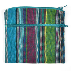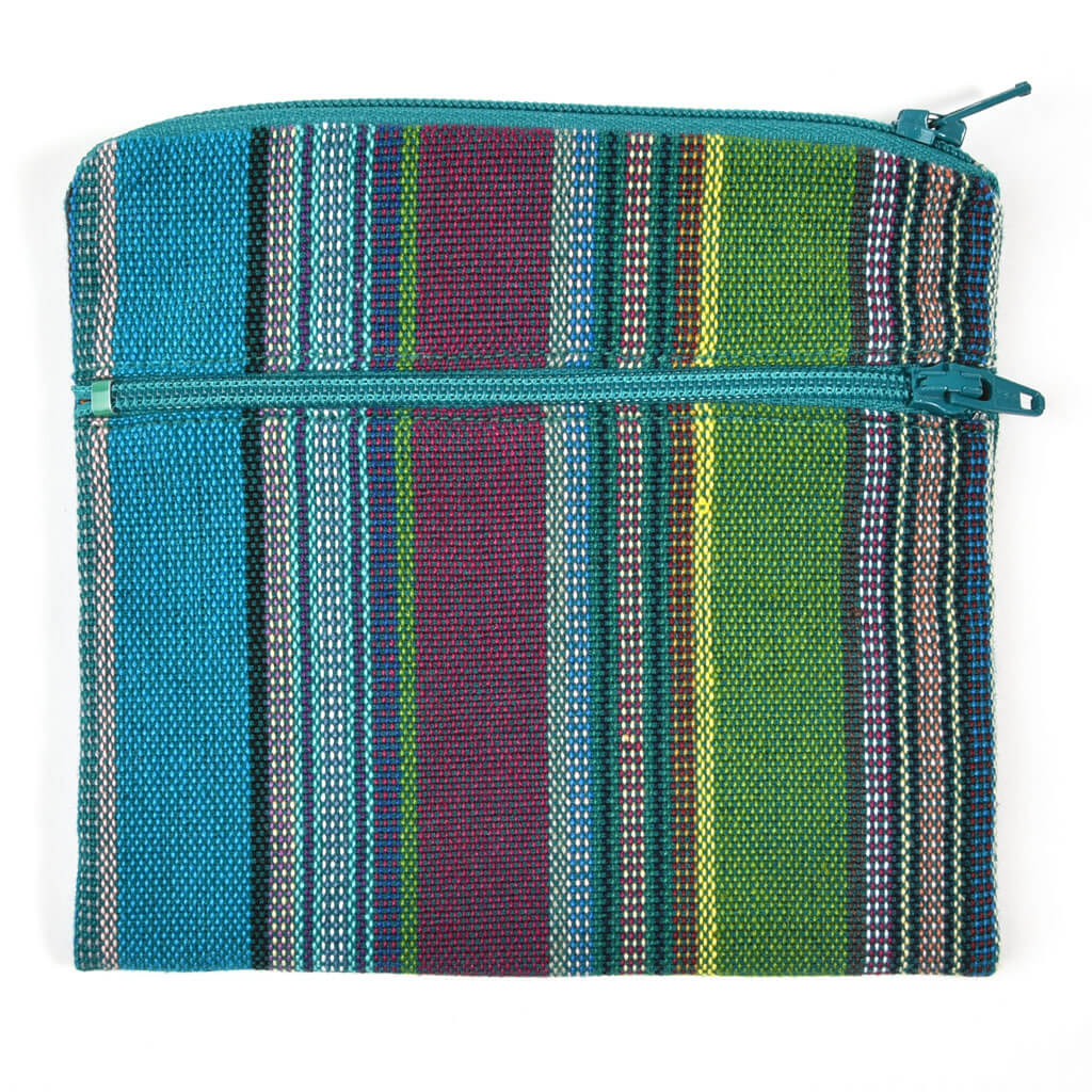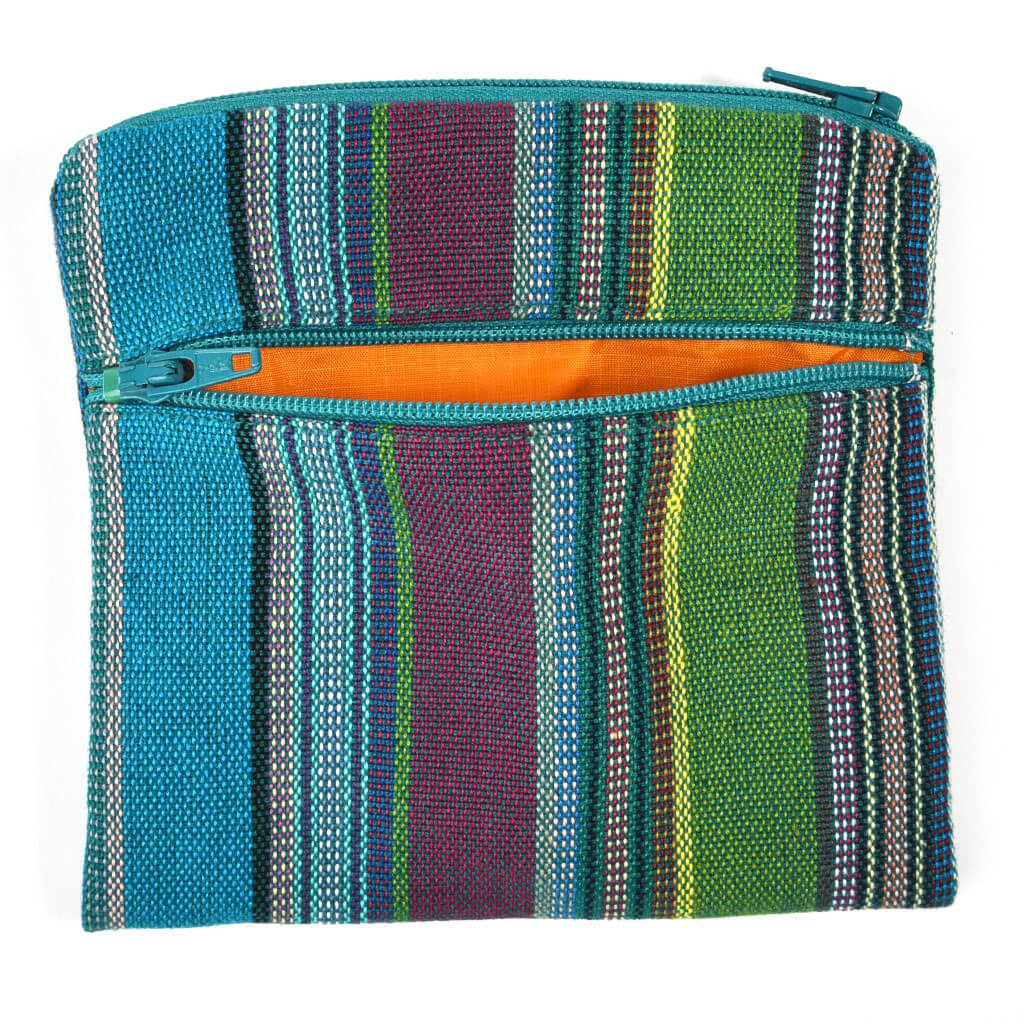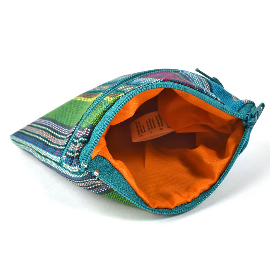 Not your ordinary change purse, our Quetzal Jade Stripe boasts teals, greens, turquoise, and blues. It features two zippers and a bright orange lining. Great for change, of course, but also for so many other duties, carrying your memory stick, carrying your business cards, credit cards, to make any of those smallish things easy to find in your bag, backpack, or pocket.  4 1/2 " H x 5" W