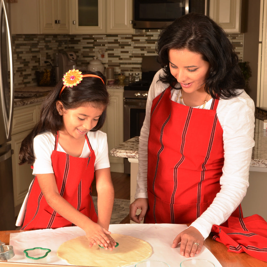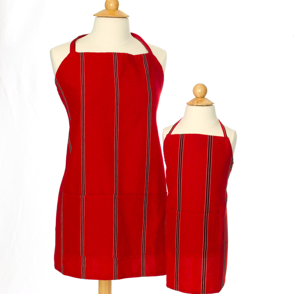 Teaching your children to cook? Be stylish in matching aprons! Here shown in our signature Cajola Red Stripes. The child-sized apron and the adult bib apron have been hand woven in sturdy easy care cotton and sport handy pockets to stash cooking or crafts tools.