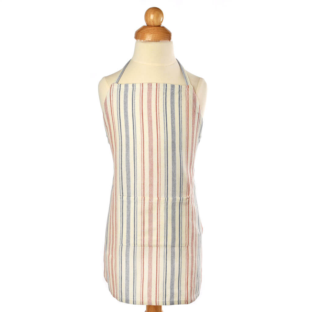 For all you budding cooks and chefs to be! A bright cinnamon and blue on cream stripe child-sized apron in sturdy handwoven cotton. Adjustable neck tie for easy on and off.  A handy pocket is ready to stash your spoons (or whatever). See the matching adult child apron set apron!