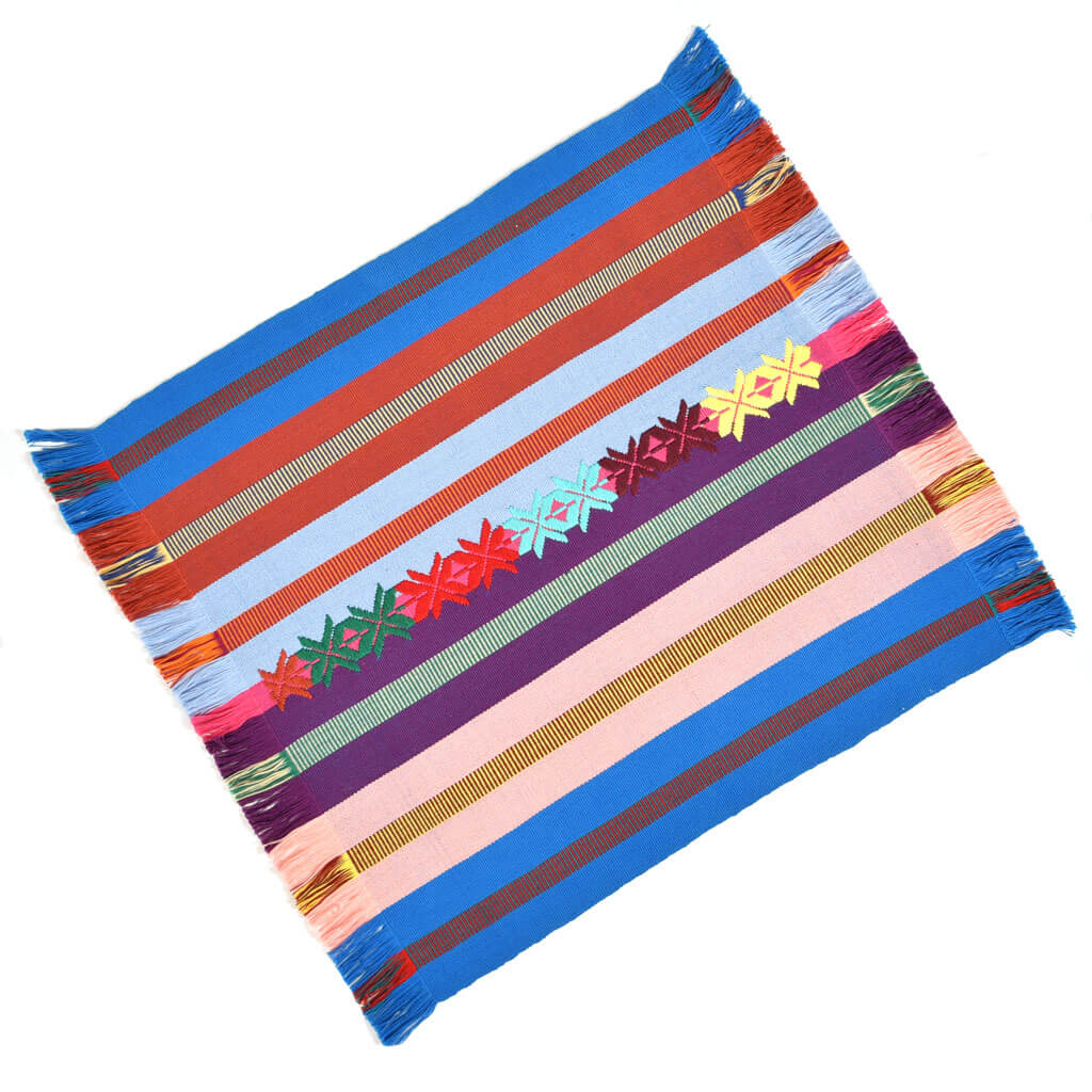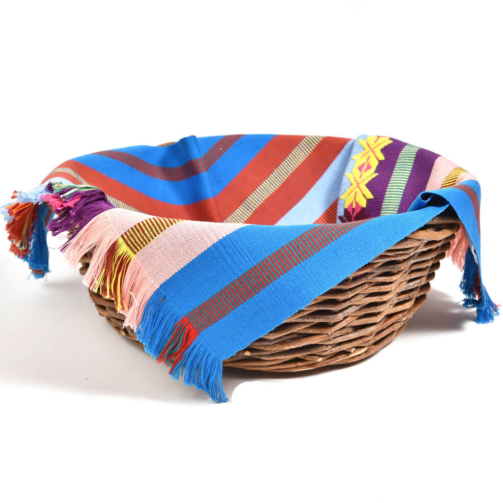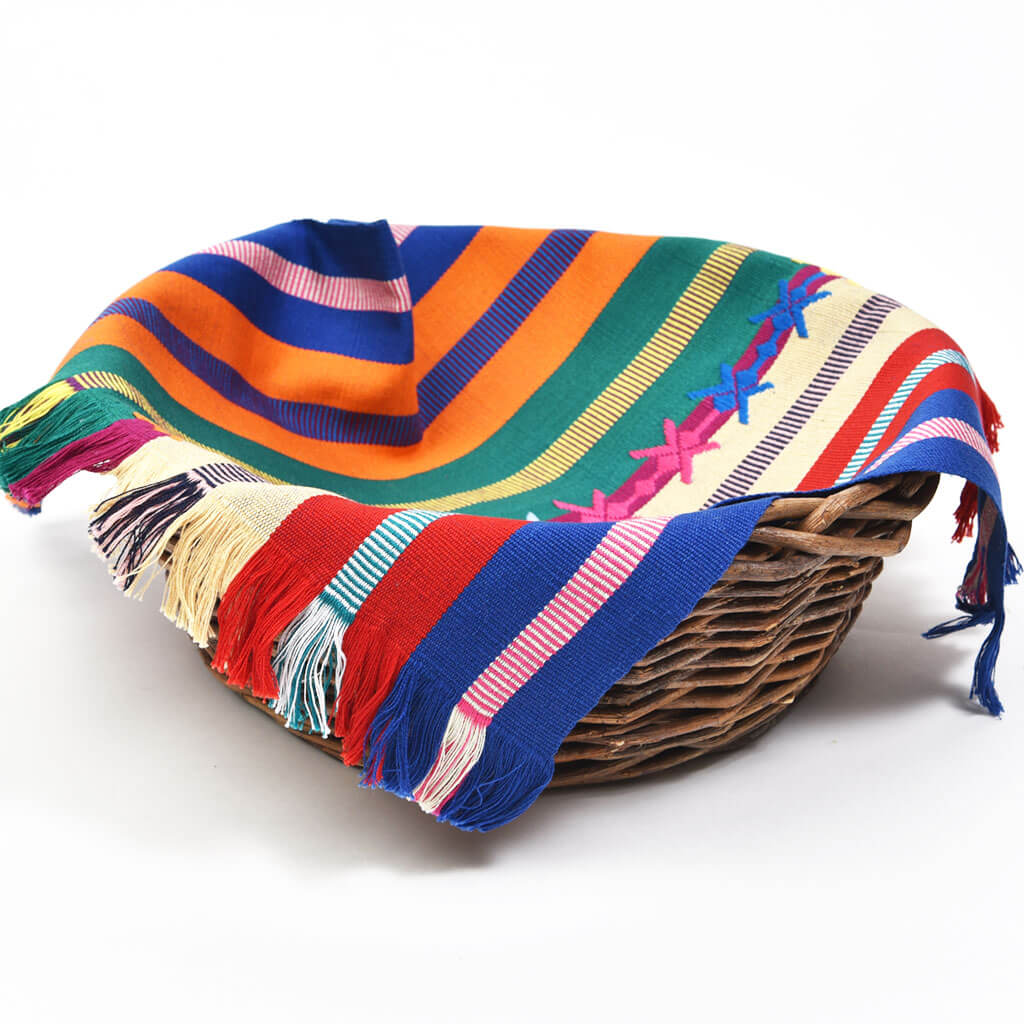 Celebration basket liners are handwoven on the traditional backstrap loom. Truly one-of-a-kind treasures, the center motifs express the Maya view of the world that everything is interconnected, different threads of the same fabric, and that nature and cosmic unity exists through diversity. Geometric motifs represent the relation among the universe, the earth, and humanity. Motifs depicting plants and flowers reflect our relationship with nature.