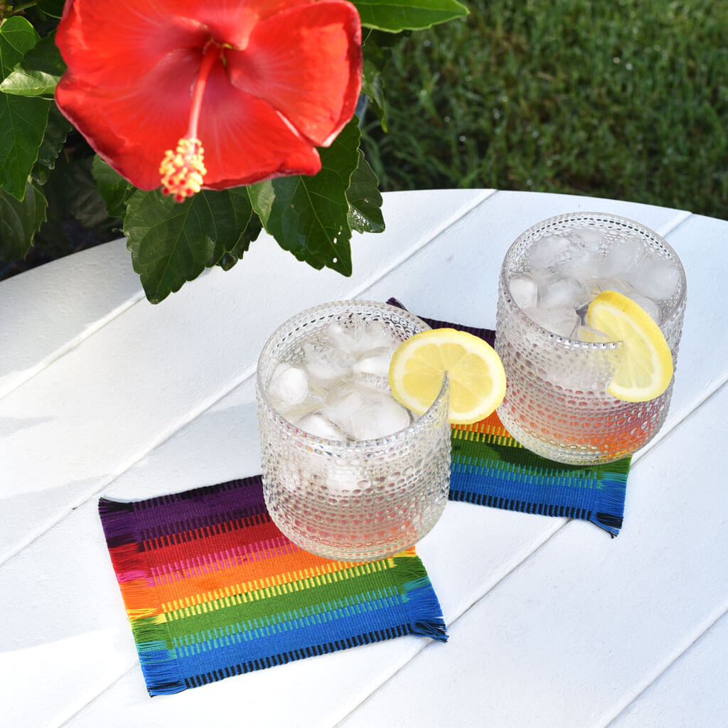 Bright Rainbow Celebration Coasters are ready to party! Handwoven on the traditional backstrap loom, they will complement your wine, margaritas, or mineral waters.