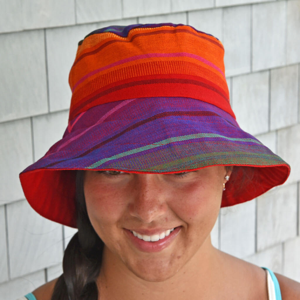 Breathable cotton bucket hat in bright rainbow colors is reversible in red cotton. Perfect for the day at the beach. One size fits most adults. Matches our beach tote and beach throw!