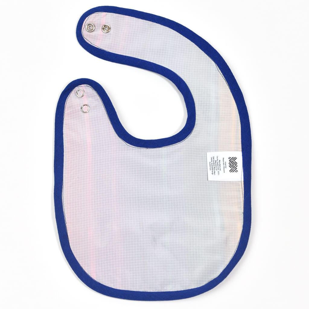Great looking and practical, the blue rainbow striped baby bib is lined in waterproof nylon and has adjustable silver snaps along with a pocket to catch who knows what.