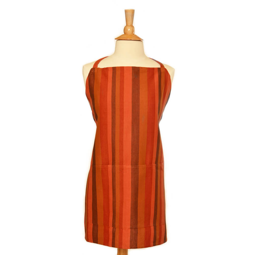 Popular traditional bib style apron with long ties at the waist and neck is perfect in the kitchen, at the grill, or the garden. Rich tones of pumpkin, coral, and brick stripes warm up your kitchen! Double front pocket is a handy place for your tools or towels.