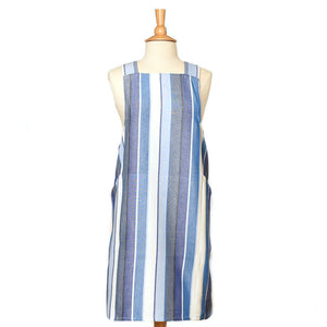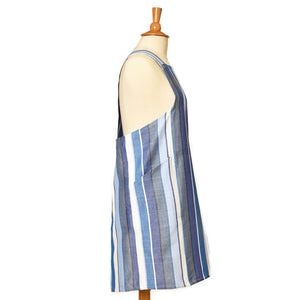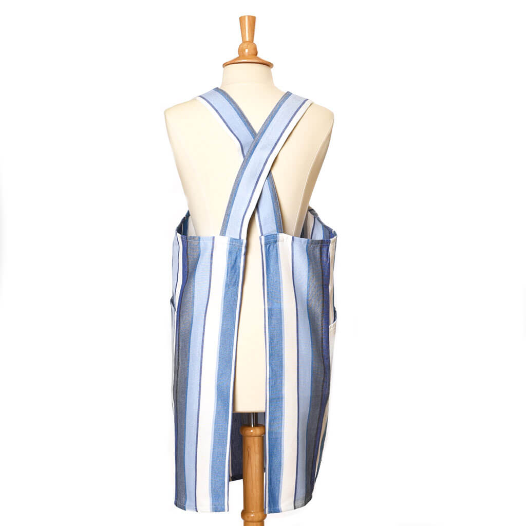 Comfortable roomy cross back style apron in bright blues & white stripes. There are two deep side pockets to keep your tools handy. Handwoven in 100% cotton it is sturdy and long lasting. Easy care wash and dry.