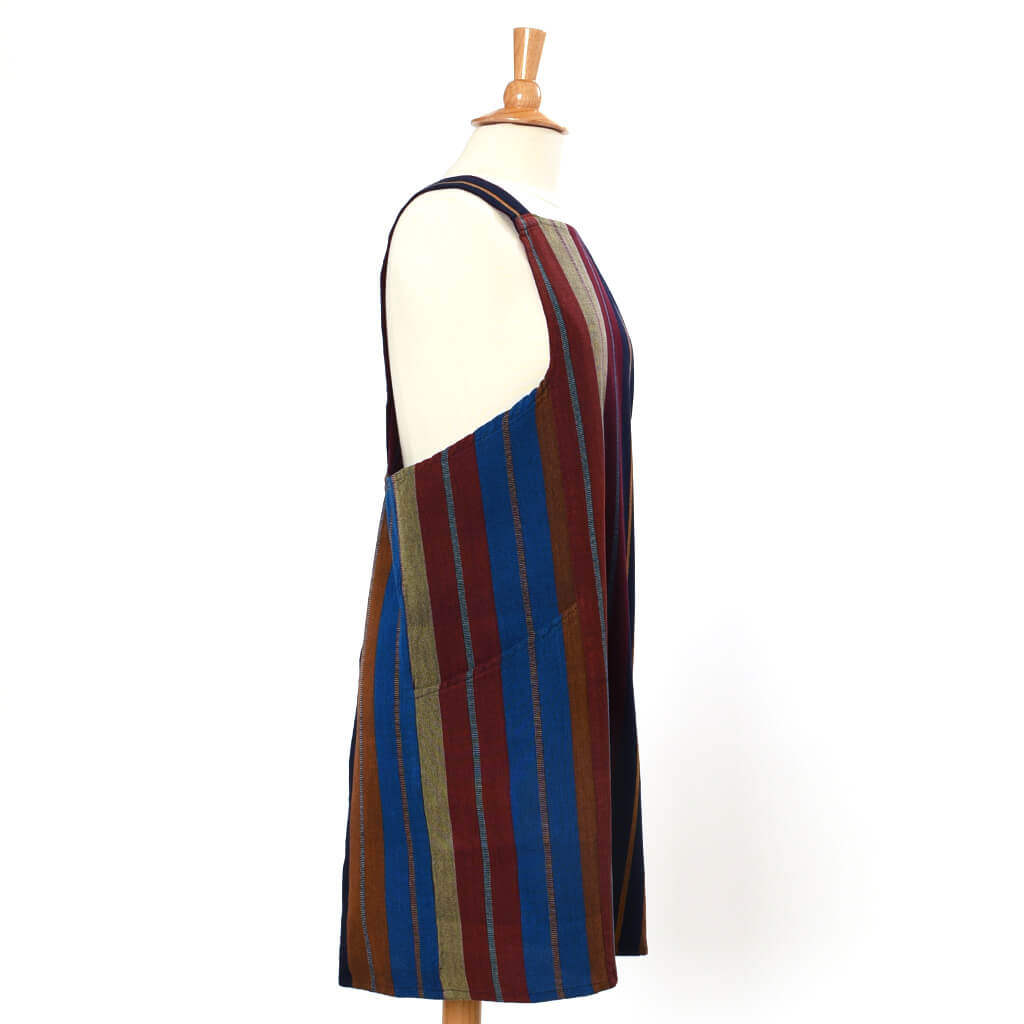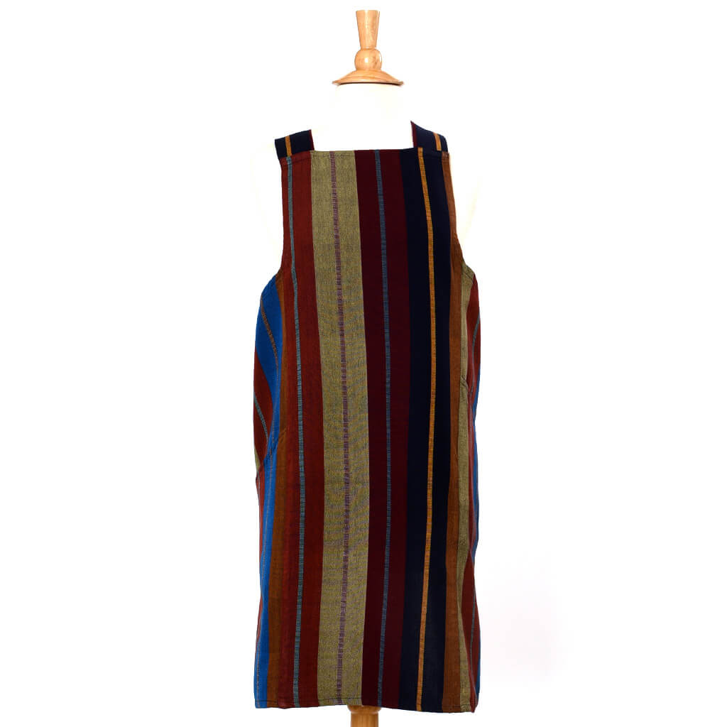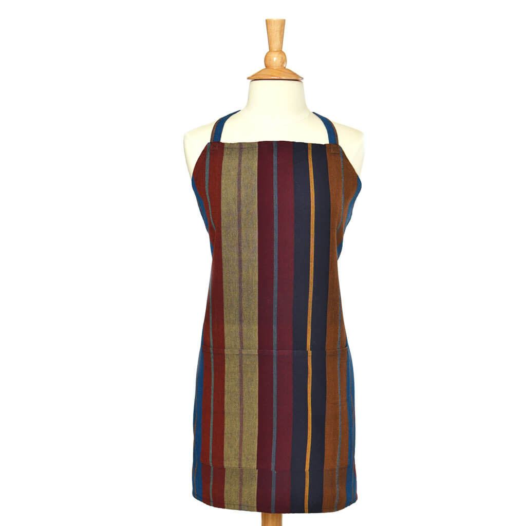 Comfortable roomy cross back style apron in rich stripes of navy, khaki, and maroon. Two deep side pockets to stash your tools. Handwoven in 100% cotton, it is sturdy and long lasting. Easy care wash and dry.