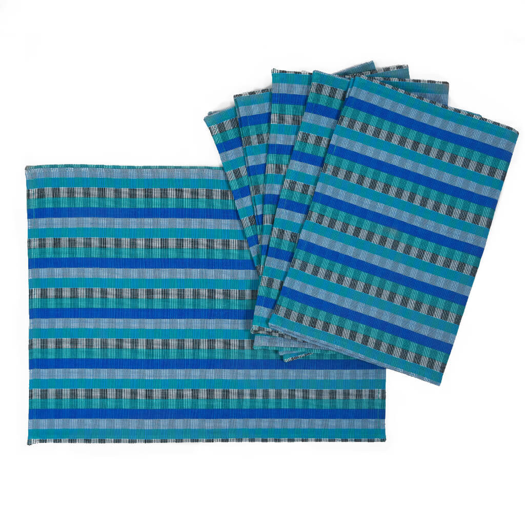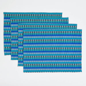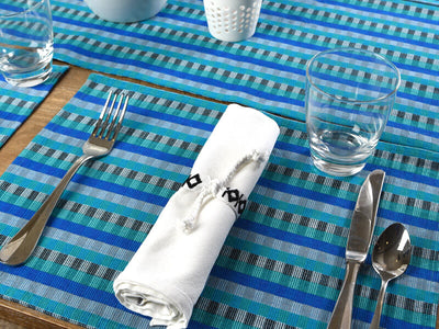 Our stunning Cuadritos weave, now in all the blues you would like. Just imagine your table setting! Cuadritos Weave was inspired by a traditional backstrap weave, then woven on the foot loom.  Handwoven in 100% cotton. The placemats feature mitered corners. Also available in a table runner. Coordinate with our Celebration Cobalt Napkins.