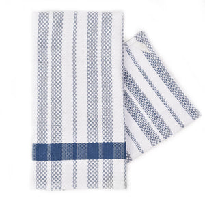 Our absorbent Hache weave kitchen towel in blue gray & white stripes with a blue gray border, is paired with a blue gray and white striped dish cloth for a handsome hostess gift set. The set includes one dish towel and one dish cloth. The name "Hache" comes from the tiny "H" you can see in the weave, but the secret to the absorbency is how much yarn is open to the air.
