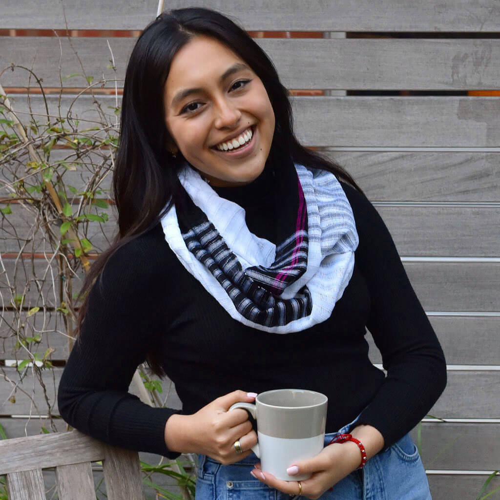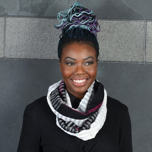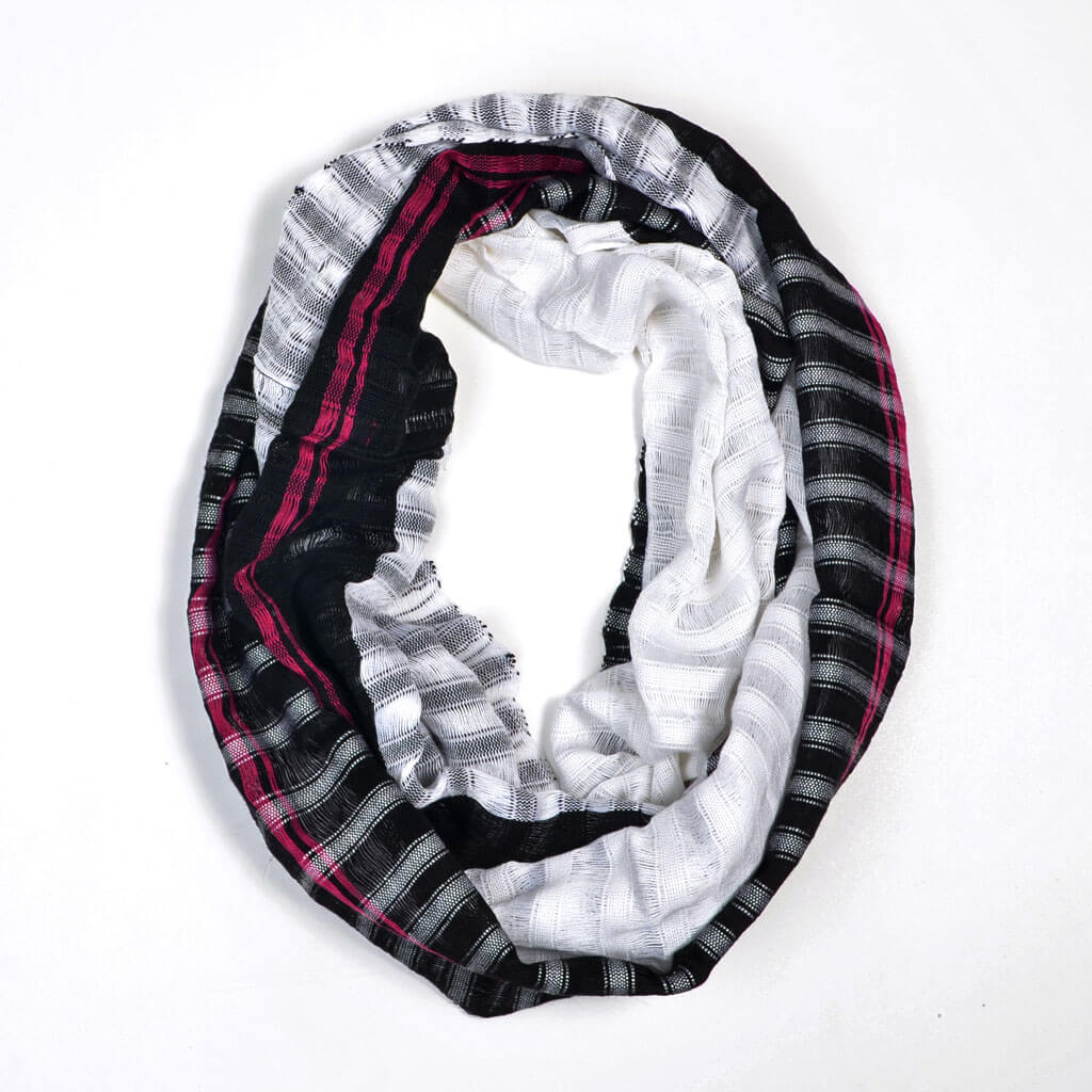 A sophisticated black and white accented with magenta pinstripes is ready for your day at work or your afternoon at leisure. The scarves have been hand woven in a light and airy windowpane weave the weavers call "weave a little, leave a little". Hand woven in 100% cotton