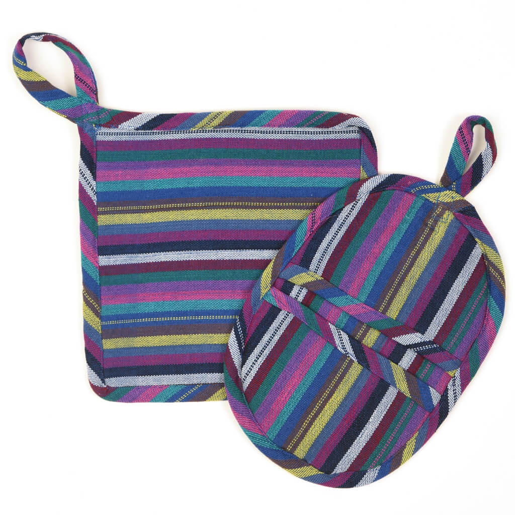 Our Pot Holder Gift set includes one of each of our styles -- a handy gripper that will help protect your hands reaching into the oven or for a pot, and a traditional square style.