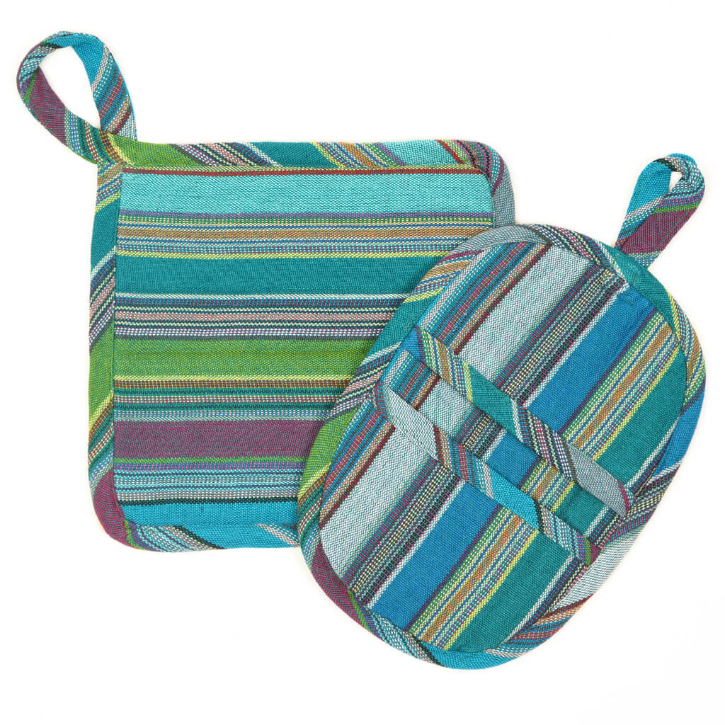 Quetzal Jade stripes feature turquoise and teals with olive accents. The Pot Holder Gift set includes one of each of our styles -- a handy gripper that will help protect your hands reaching into the oven or for a pot, and a traditional square style.
