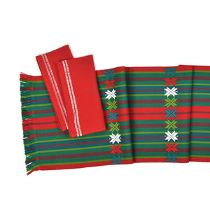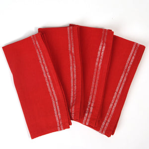 Ready to celebrate, our bright red table napkins are accented by silver metallic railroad stripes. They are hand woven in 100% cotton and have mitered corners. Easy to care for.