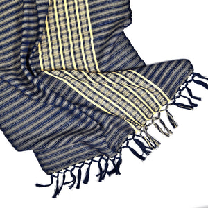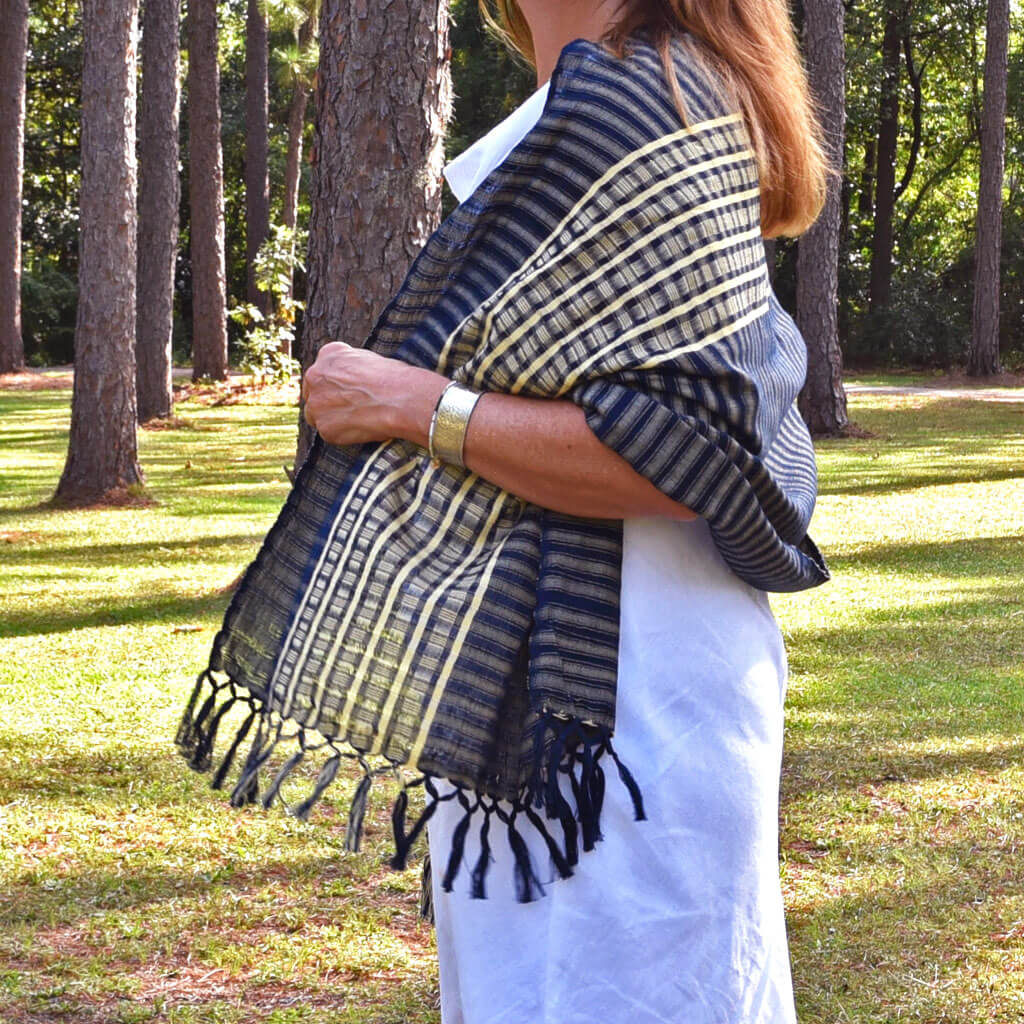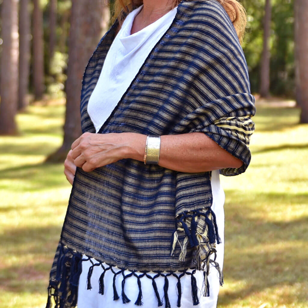 Our lighter weight wrap featuring a deep navy with highlights of champagne is the same weave as our scarves. Hand woven in 100% cotton, it is perfect for cool evenings when you want a light stylish cover up. Makes a great travel wrap, too.