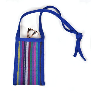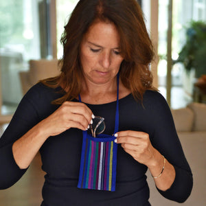 Keep your eye glasses close by and protected with this Eyeglass Catcher in our Cobalt Stripe feauturing a vibrant pattern of blues, magenta, yellow and more. Whether you use readers or sunglasses, they will always be available when you slip them into the hand woven cotton pouch and wear around your neck to keep your hands free.