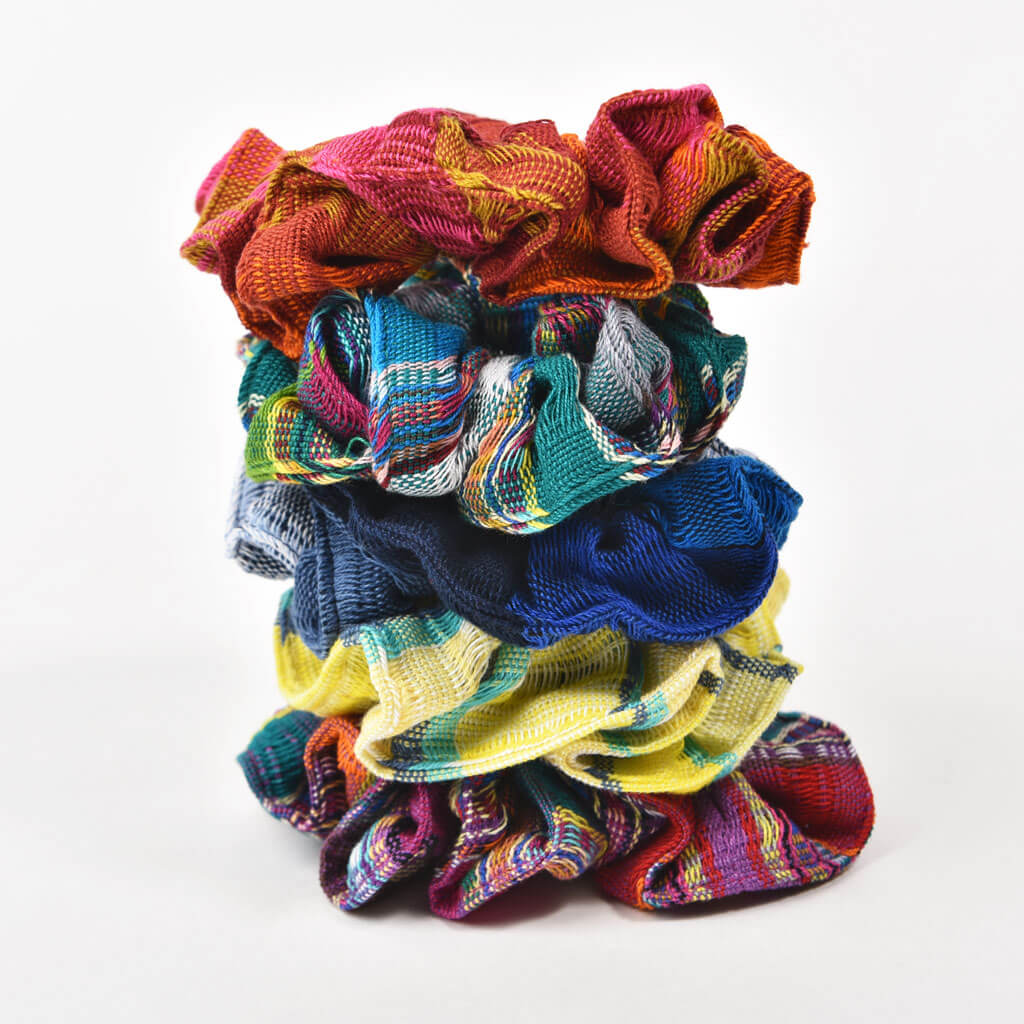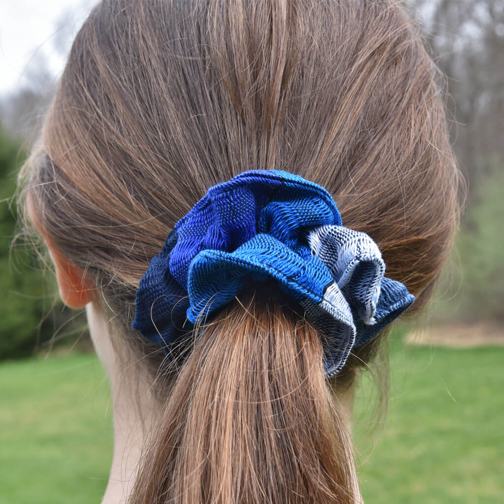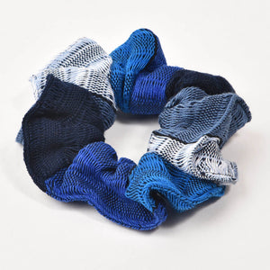 Add a pop of color to your hair or your wrist with our Blues scrunchie. Shades of blue can complement your outfit. Made from handwoven windowpane weave cotton with an elastic band insert.