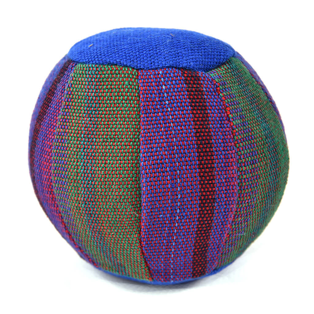 Baby’s first ball, this colorful Blue Purple & Green striped cotton stuffed patchwork ball is completely washable and stuffed with a bamboo/polyester blend. Exterior is 100% hand woven cotton, dyed with nontoxic dyes. Approximately 3 1/2” in diameter, it is ready to touch, cuddle or toss.