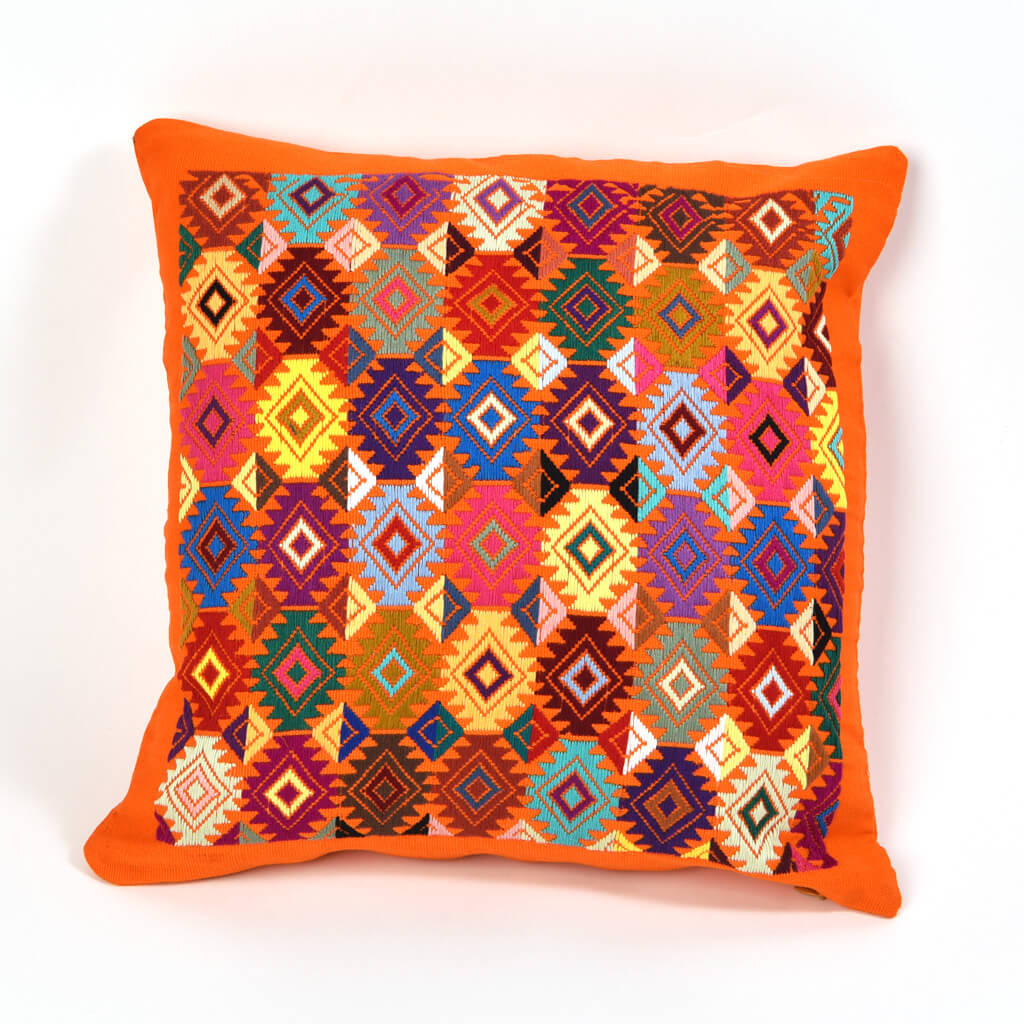 Bright Tangerine brocaded in bright multicolor provides a bold pop of color in our beautifully hand woven brocade pillows. Distinctive Guatemala weaving, each pillow is one of a kind and takes many hours to complete. The back is handwoven tangerine cotton. Pillows close with a YKK invisible zipper.